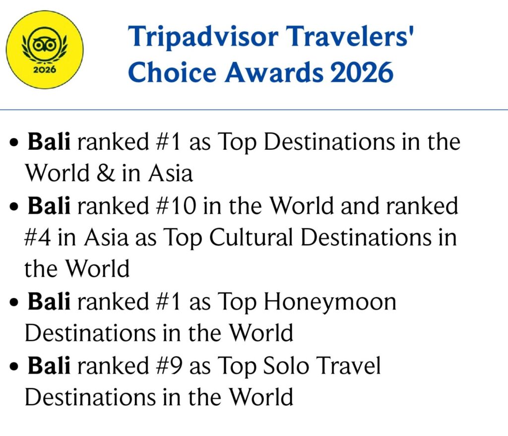 Salah satu pencapaian paling prestisius diraih oleh Pulau Bali yang secara resmi dinobatkan sebagai Peringkat 1 Destinasi Terbaik Dunia 2026 dan Terbaik di Asia dalam ajang Travelers’ Choice Awards 2026 oleh TripAdvisor, melalui kategori Top Destinations in the World and in Asia.